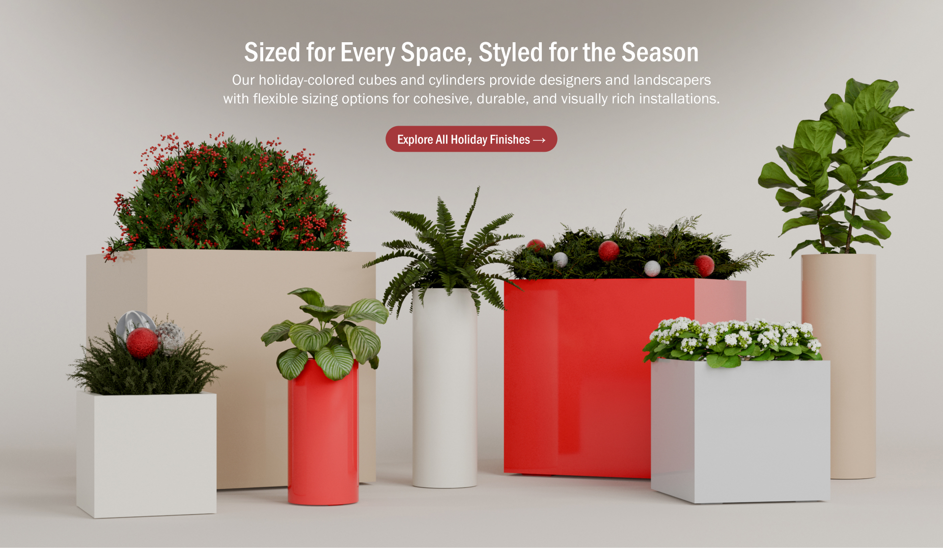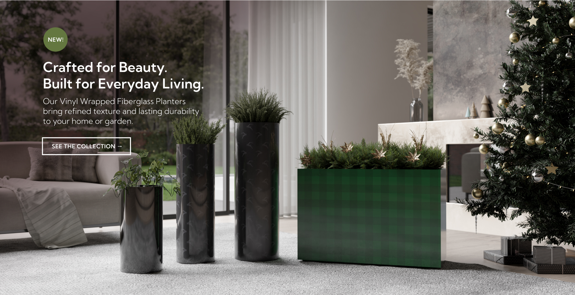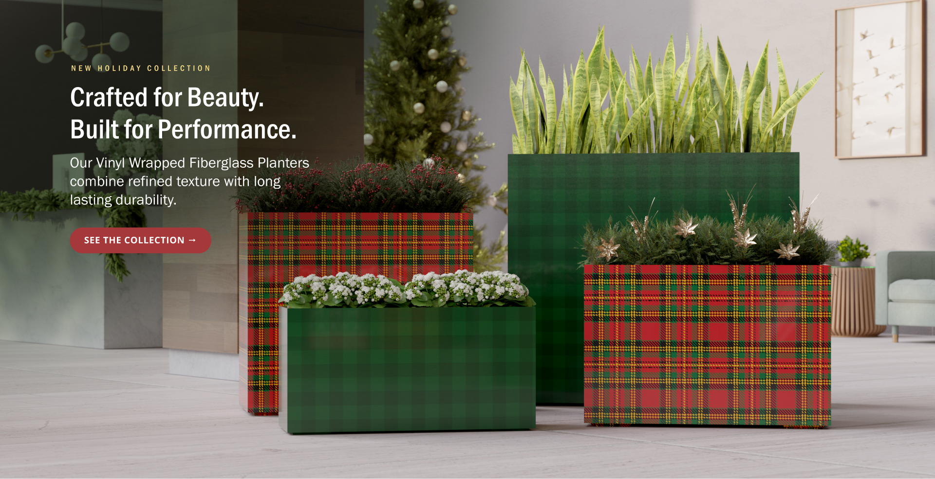 The holiday vinyl wrap collection was a new product line: brand new finishes on select planter styles that didn’t exist yet in physical form. Marketing needed imagery to launch the campaign and drive pre-orders from professional plantscapers, a B2B audience that typically relies on seeing physical product before committing to an order.